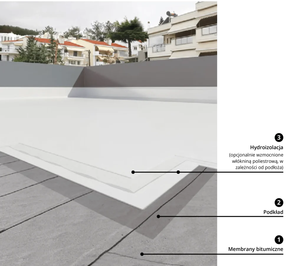 Zalecane rozwiązanie: Płynna membrana hydroizolacyjna z poliuretanu i pokrycie nawierzchniową warstwa poliuretanową